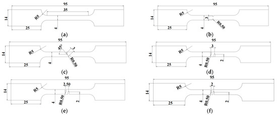 Geometries of the smooth dog bone (SDB) and notched dog bone (NDB) specimens with various notch geometries (unit: mm)): (a) SDB; (b) NDB0; (c) NDB45; (d) NDB90(3); (e) NDB90(2.5); and (f) NDB90(2).