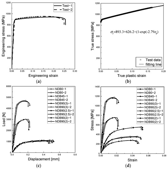 Stress–strain curves obtained from the tensile tests: (a) engineering stress–strain curves of SDB specimen; (b) True stress–plastic strain curves of SDB specimens fitted by Voce hardening model; (c) load–displacement curves of NDB specimens with various notch geometries; and (d) average stress–strain curves of NDB specimens with various notch geometries.