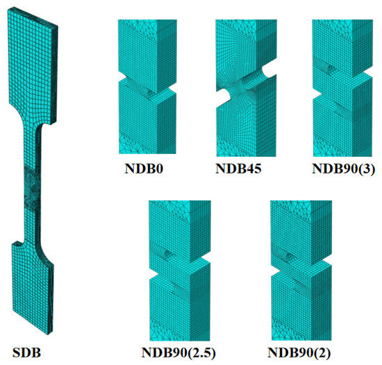 3D FEA models of SDB and NDB specimens were constructed in ABAQUS/CAE. The dimensions were the same as those given in Figure 1. As shown in Figure 7, the gauge section was discretized using C3D8R elements (8-node linear brick elements with reduced integration). The C3D8R element was chosen for its computational efficiency and ability to capture large plastic deformation without volumetric locking. A convergence study was carried out by progressively refining the mesh until the change in equivalent strain was negligible. A mesh size of 0.2 mm was ultimately selected. Boundary conditions followed those applied in the test setting. Material properties were defined with the Abaqus user material subroutine VUMAT. To obtain the quasi-static state, semi-automatic mass scaling was used with the target time increment of 10−4 at the beginning of the step. The ratio of kinetic to internal energy was kept below 1%.