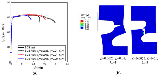 FEA results with various parameter values in shear-modified GTN model: (a) FEA results for stress–strain curves; (b) FEA results for failure locations.