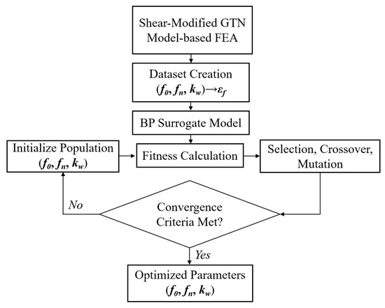 Due to the strong nonlinear influence of these three parameters on fracture strain, this study first obtained fracture strain values for various specimens under different parameter combinations through FEA. Subsequently, a surrogate model for fracture strain prediction was established using a BP neural network. Building on this foundation, the optimal values for , , and could be determined by coupling the model with a GA. The overall framework is shown in Figure 9. According to related research papers [7,33,34], the value ranges of the three parameters are shown in Table 2. Meanwhile, considering optimization efficiency and the stress state of specimens, three specimens—NDB0, SDB, and NDB90(2)—were selected to establish the surrogate models and optimize the model parameters. These specimens correspond to high, medium, and low levels of triaxial stress states, respectively.