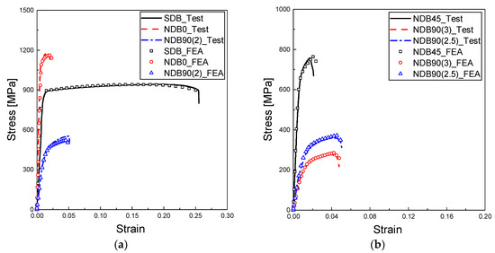 Comparisons of stress–strain curves from test and FEA: (a) SDB, NDB0, and NDB90(2) specimens; (b) NDB45, NDB90(3), and NDB90(2.5) specimens.