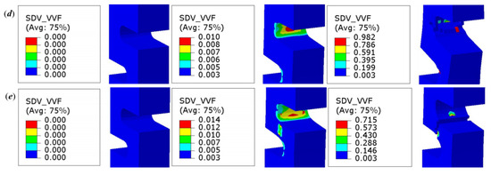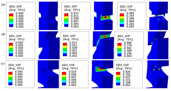 For void nucleation, the three following parameters are involved: the possible nucleated VVF (), the average equivalent plastic strain (), and the standard deviation of the nucleation strain (). To simplify parameter calibration, and were determined as 0.3 and 0.1, according to relevant studies [33]. Thus, only , , and needed to be determined for the shear-modified GTN model. These three parameters not only affect the stress–strain curve, but also influence the specific failure location of the specimen, as shown in Figure 8. It can be observed that, since is correlated with both and , a larger obtained greater fracture strain, with all other parameters being equal. Furthermore, increasing the value of shifted the failure mode of specimen NDB90(2) from tension-dominated to shear-dominated, as illustrated in Figure 8b.