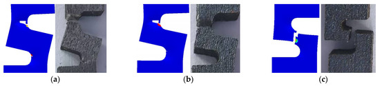 Comparison of failure locations in FEA and tests: (a) NDB90(3) specimen; (b) NDB90(2.5) specimen; and (c) NDB90(2) specimen.