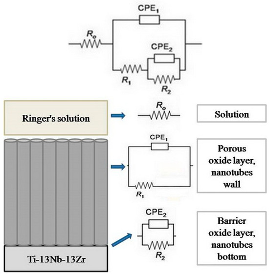 Figure 1 presents the corresponding equivalent electrical circuit (EEC), which was utilized for fitting the results of titanium alloy EIS testing [56]. EIS data analysis was conducted using Gamry Instruments Echem Analyst software, version 5.50. The quality of the impedance data fitting to the equivalent electrical circuit (EEC) model was evaluated using the “Goodness of Fit” parameter. In all tested conditions, this value remained below 2.3 × 10−4, indicating that the EEC model was suitable for fitting the obtained electrochemical impedance spectroscopy (EIS) results.