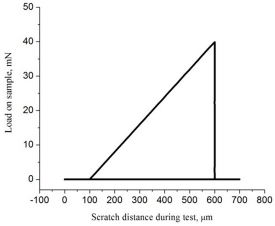 During this test, the normal force on the sample was controlled and increased. The scratch test procedure consists of 3 steps: First, a very small load was applied to detect the morphology of the same surface. Then, along the same scratch path, a normal force was applied that increases from the starting to the maximum scratch load. Finally, a very small force was used for the next profile, which measures the residual deformations in the indentations.