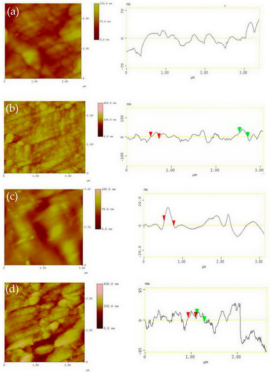 Figure 5 presents 2D AFM diagrams and linear profiles for the CG and UFG TNZ alloys before and after AO. A distinct variation in peak height is observed. The measured value of Ra for the non-anodized CG surface is 6.6 nm and the non-anodized UFG surface is 3.6 nm, while for the anodized CG surface it is 19.1 nm and for the anodized UFG surface it is 34.1 nm (Figure 4b). As a result of AFM measurement, the RMS (root mean squared) roughness of the anodized and non-anodized CG and UFG TNZ alloys was also obtained. RMS presents the standard deviation of the heights of the profile, and it is a more precise indicator of roughness because it includes the entire defined surface. As we present in our previous paper [7,64], the RMS value for the non-anodized CG TNZ was 2.36 nm and the anodized CG TNZ was 11.27 nm, while for the non-anodized UFG TNZ it was 4.52 and for anodized UFG TNZ it was 17.12 nm (Figure 4b). Results show that larger diameters of the nanotubes lead to higher surface roughness values due to the more pronounced surface topography. On the other hand, thicker walls of the nanotubes can lead to a denser and rougher structure. The homogeneity of the nanotube oxide layer formed using anodic oxidation significantly affects roughness consistency across the surface. A uniform, highly ordered nanotube oxide layer results in consistent roughness, favorable for biomedical applications like improved cell adhesion. In contrast, an inhomogeneous nanotube oxide layer can create micro-rough areas or defects, leading to unpredictable surface behavior and decreased biocompatibility. Although HPT is not a surface modification treatment, it can influence surface roughness indirectly. Results show that the HPT process can slightly change roughness, probably due to intense shear strain. However, polishing or surface modification treatments after the HPT process are often applied to tailor the roughness of the surface for specific applications. Moreover, the refined microstructure using the HPT process enhances the uniformity of the nanotube oxide layer, promoting the formation of a more homogeneous nanotube oxide layer, which can also help control the roughness of the surface more precisely.