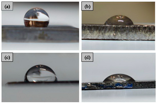 Contact angle images of (a) CG TNZ, (b) CG TNZ after anodic oxidation, (c) UFG TNZ, and (d) UFG TNZ after anodic oxidation.