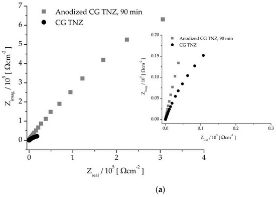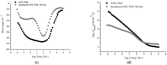 As can be seen in Figure 9b,d, an impedance magnitude around 105 Ωcm2 achieved in the low-frequency region indicates good corrosion resistance, while a value in the order of magnitude around 103 Ωcm2 for UFG TNZ, after anodic oxidation, indicates a drop in corrosion stability. For all materials, Zmod values in the order of 101 Ωcm2 in the frequency range of 0–100 kHz and phase angles close to 0° were achieved, which indicates the significant thickness of the outer porous layer [78]. In the Bode phase angle diagram, Figure 9a,c, wide peaks for CG TNZ after anodic oxidation and the UFG TNZ alloy indicate better their corrosion stability compared to their counterparts, CG TNZ and UFG TNZ, after anodic oxidation, respectively.