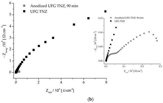 The surface of the UFG TNZ alloy exhibits a greater thickness of the nanotube oxide layer than that of the CG TNZ alloy. This is indicated based on the capacitance (CPE) value because the CPE value of nanotube oxide layer on the UFG TNZ is lower than the CPE value of the nanotube oxide layer on the CG TNZ. Also, results in our previous paper [42] indicate that the HPT process leads to the possibility of obtaining a greater thickness in the oxide layer, i.e., longer nanotubes, after the anodic oxidation process. On the other hand, the thickness of the oxide layer on the surface after anodic oxidation is greater than that formed on the surface before anodic oxidation for both materials. It was also shown that the capacitance (CPE) of the nanotube oxide layer is lower than the capacitance of the naturally formed oxide layer. The coefficient n takes on values in the interval 0.65–0.86, as can be seen in Table 2.