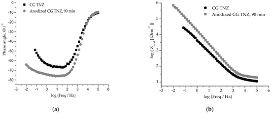 The electrochemical impedance spectrum for the UFG and CG TNZ alloys, before and after anodic oxidation, is shown using Nyquist (Figure 8) and Bode (Figure 9) charts. All of the tested materials have the properties of corrosion stability, where it can be seen, based on the shape of the diagram and size of the semicircle diameter, that the CG TNZ, after anodic oxidation, has the best corrosion resistance of the nanotube oxide layer (Figure 8a). The Bode diagram has two time constants that describe the two oxide layers.