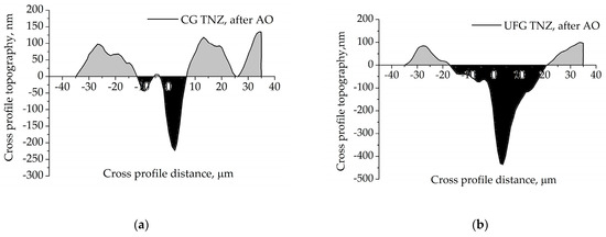 Figure 10 presents the profile along the cross-section of the scratched surface of CG TNZ and UFG TNZ after anodic oxidation for 90 min. As can be seen, the cross-section of the scratch is composed of two regions, groove area (GA) and pile-up areas (PA1, PA2) (show in Figure 10 in black and gray colors), while summation of PA1 and PA2 presents material remove area (MRA), Figure 10.