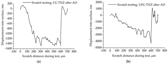 Figure 11 presents the scratch test curve for the CG TNZ and UFG TNZ surfaces after anodic oxidation. In the case of the UFG TNZ surface, the slope of the scratch curve decreases with increasing displacement into the surface (when the mass of the nanotubes layer increased) (Figure 11). As can be seen, in the first and latter stages of the scratch, both curves indicate reapplication to the applied load. The slope of the scratch curves is relatively stiff (along scratch distance), indicating a slim possibility to annul the applied load. These facts indicate that the failure of the nanotube oxide layer occurred along the length of the scratch.