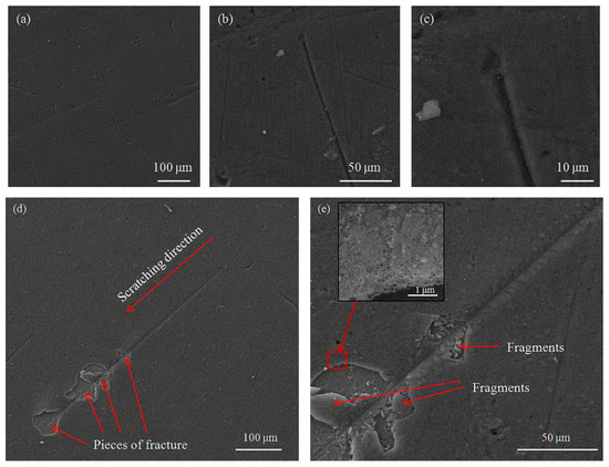 Scratch test curves show three regions, the ductile region, transition region (brittle-ductile transition) and brittle region, while large fluctuations appear at the beginning of region change. According to the literature [92], the appearance and changes in the diagram, as well as the surface morphology characteristics of the scratch, depend on the normal loading rate, indenter, and direction of the indenter, but it indicates that the above-mentioned three regions comprise every scratch test curve. Figure 12 presents the morphology characteristics of the scratch and damage to the oxide layer after the scratch test for CG TNZ and UFG TNZ surfaces after AO. Figure 12a–c present the whole scratch, some part of the scratch, and the final part of the scratch obtained on the CG TNZ surface after anodic oxidation. As can be seen, the scratch exists with a visible lateral accumulation of oxide layer material on both sides of the scratch’s edge. Also, at the final part of the scratch, accumulation of the material exists. On the other hand, Figure 12d,e, presents the whole scratch and some part of the scratch obtained on the UFG TNZ surface after anodic oxidation. As can be seen, with the progress of the scratching, both sides of the scratch show cracks and pieces of the fracture with much smaller or larger fragments of material (shown with red arrows). A previous paper showed that damaged to the oxide layer on the titanium-based surfaces is possible, but the adhesion of the coating is sustainable [93,94,95,96,97]. Zielenski et al. [93] noticed that the nanotube oxide layer created on the Ti-13Nb-13Zr alloy has a delamination mechanism associated with the brittle fracturing. Durdu et al. [94] created a nanotube oxide layer on a titanium alloy using anodic oxidation with different voltages and showed that increasing the voltage led to the increasing adhesion of the nanotube oxide layer. Sarraf et al. [95] researched the adhesion of the nanotube oxide layer created on the Ti-6Al-4V. They showed that adhesion increased after annealing. Hu et al. [96] showed that forming the homogeneous nanotube oxide layers after the HPT process led to improvements in their adhesion. Dikova et al. [97] showed that a higher roughness of the surface of titanium-based materials led to delamination of the smaller areas of the nanotube oxide layer after scratch-testing. The results of our study show that damage to the nanotube oxide layer occurs, but the magnification of the SEM image shows that the nanotubes are still adhesively stable at the very edges of the scratch (Figure 12e).