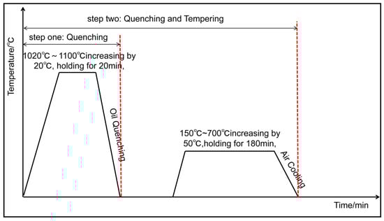 The material utilized in this study is martensitic stainless-steel plate 90Cr18MoV, which has undergone hot rolling and annealing processes(This material has been independently smelted and rolled by our research institution.). The chemical composition of the steels is shown in Table 1. The sample size is 10 mm × 8 mm × 4 mm (length × width × height). The heat treatment process for 90Cr18MoV stainless steel is illustrated in Figure 1. As shown in Figure 1, this experiment investigates the quenching treatment of 90Cr18MoV within a temperature range of 1020 °C to 1100 °C, with increments of 20 °C as individual research subjects. The quenching duration is set at 20 min, and oil is utilized for cooling the samples. To explore the effects of different tempering temperatures on the internal structure and properties of the material, we examine a temperature range from 150 °C to 700 °C, stepping in increments of 50 °C as separate research subjects. The tempering time is established at 180 min. We designate the material after quenching as Q-W, where Q represents the quenching process and W denotes the quenching temperature. We designated the samples that underwent tempering as QT-X/Y, where QT denotes quenching followed by tempering, X represents the tempering temperature, and Y indicates the duration of tempering.