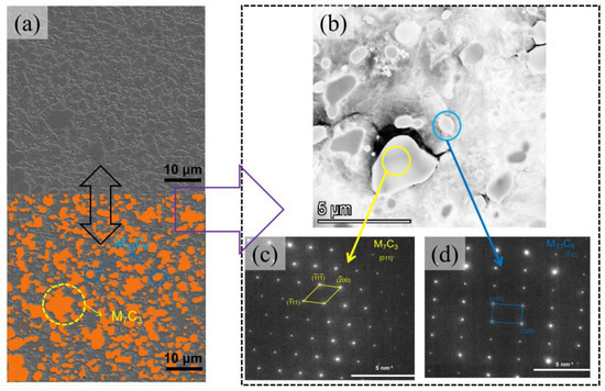 Figure 2a shows the morphology of the microstructure of the 90Cr18MoV samples as received. The carbides (orange marker) occupied a large portion of the 90Cr18MoV matrix. The corresponding TEM images of carbides are shown in Figure 2b–d. The diffraction patterns indicate that these large carbides are composed mainly of M7C3 inside grains (marked in yellow) while the small carbides are composed mainly of M23C6 (marked in blue).