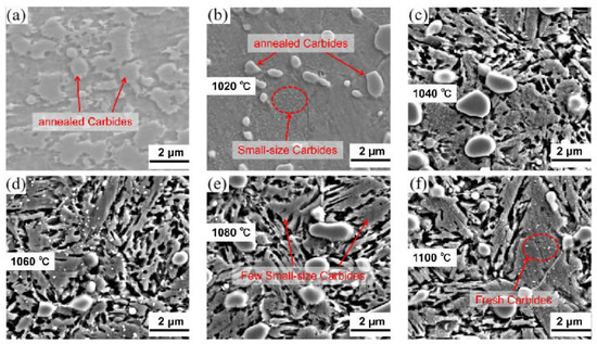 Martensite formed due to the post-quenching processes, as a supersaturated solid solution of carbon, has been believed to present high hardness [23]. To obtain high hardness, the 90Cr18MoV were quenched at different temperatures of 1020 °C, 1040 °C, 1060 °C, 1080 °C, and 1100 °C. We designated these samples as Q-1020, Q-1040, Q-1060, Q-1080, and Q-1100, respectively. The microstructure of 90Cr18MoV before and after different quenching temperatures are shown in Figure 3. The presence of a large area of precipitated carbides in the original sample, as shown in Figure 3a, is attributed to the annealing process that facilitates the precipitation within the carbide matrix, thereby softening the material and making it easier to process.