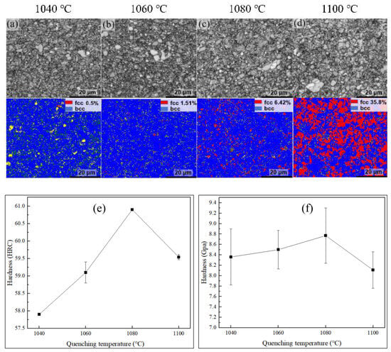 As the temperature increases, the carbides in the matrix gradually diminish. Larger carbides decrease in size, while smaller carbides completely dissolve back into the matrix. In Figure 3e, it can be observed that no minute carbides are present in the matrix of the Q-1080 sample. However, as shown in Figure 3f, with a further elevation of the temperature, carbides begin to reappear in the matrix of the Q-1100 sample. At the same time, an increase in carbon concentration of the matrix resulted in a decrease in the martensitic transformation temperature. This phenomenon leads to an incomplete austenite to martensite transformation under different quenching conditions. The phase structure analysis was conducted on the samples subjected to quenching using EBSD, and the results are presented in Figure 4. At a quenching temperature of 1040 °C, the retained austenite having an fcc structure is labeled in red and its area fraction is 0.5% as shown in Figure 4a–d. The fraction of the fcc structure increased to 1.15% after quenching at a temperature of 1060 °C. The fraction of the fcc structure increased to 6.42% after quenching at a temperature of 1080 °C. After quenching at 1100 °C, the fraction of the fcc structure reached up to 35.8%. Therefore, as the quenching temperature increases, the content of austenite in the matrix also rises. Concurrently, fine carbides gradually dissolve back into the matrix with increasing quenching temperatures, leading to an increase in carbon content within the matrix. Since carbon (C) is a stabilizing element for austenite [24], a higher carbon content enhances the stability of austenite during heat treatment. Consequently, residual austenite becomes more prevalent with rising quenching temperatures, which aligns with findings from other studies [25,26]. In this research, we determined that the critical quenching temperature for carbon dissolution is 1060 °C.