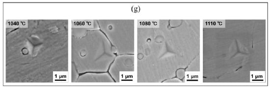 To investigate the effect of an increasing quenching temperature on the microstructure and hardness of 90Cr18MoV, we conducted hardness characterization on samples quenched at different temperatures, as illustrated in Figure 4d,e. Under identical quenching times, the macroscopic hardness of 90Cr18MoV initially increases with a rising quenching temperature before subsequently decreasing. A similar trend is observed in the microscopic organizational hardness, which also shows an initial increase followed by a decline. Notably, samples quenched at 1080 °C exhibit maximum hardness values of 61 HRC and 8.8 GPa. The hardness of 440C martensitic stainless steel obtained through deep cryogenic treatment, as reported by A. Idayan et al., is approximately 60 HRC [27]. To validate that the measured microscopic hardness reflects the material’s structural integrity, we performed SEM scanning analysis on samples post-nanoindentation testing, as shown in Figure 4f.