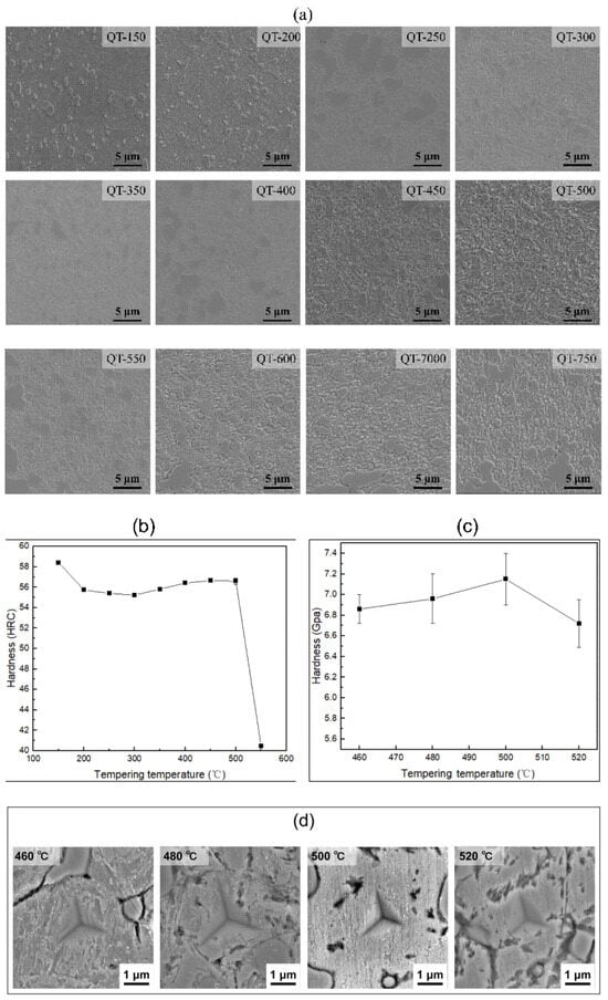 To investigate the relationship between the hardness of tempered samples and tempering temperature, we conducted a macro-hardness analysis on samples tempered at different temperatures, as illustrated in Figure 5b. The hardness of the samples exhibited an initial increase followed by a decrease with rising tempering temperatures. Additionally, to examine the secondary hardening characteristics of the matrix in tempered samples, we performed nanoindentation hardness analysis on specimens tempered at 460 °C, 480 °C, 500 °C, and 520 °C. By combining nanoindentation techniques with scanning electron microscopy (SEM), we assessed the hardness of the matrix for these specific tempering temperatures. As shown in Figure 5c,d the maximum nanoindentation hardness achieved during secondary hardening of the tempered samples was found to be 7.2 GPa. The maximum macrohardness is 57 HRC.