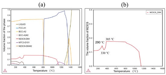 Figure 6b presents the phase composition diagram of M23C6 at equilibrium, simulated using Thermo-Calc. It is evident that there is a significant increase in the presence of M23C6 within the temperature range of 330 °C to 385 °C, after which it begins to re-dissolve into the matrix at temperatures exceeding 800 °C. Although the processing methods employed in this study do not allow for the samples to achieve complete equilibrium at identical temperatures, the overall trend remains consistent. Consequently, during the tempering process, precipitation of M23C6 will occur. In order to investigate the precipitation conditions of the M23C6 phase that are compatible with industrial production, we will employ transmission electron microscopy for a more detailed analysis of the samples.