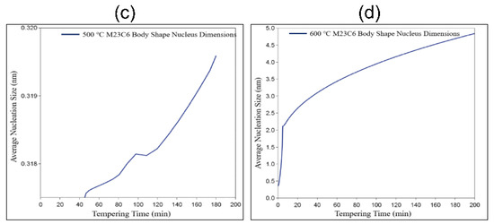 It can be observed that at a temperature of 500 °C, as the holding time increases, both M23C6 exhibit continuous growth in their nucleation sizes. Likewise, at a temperature of 600 °C, an increase in the holding time also leads to an enhancement in the size of M23C6 nuclei. However, it is noteworthy that the sizes of precipitated carbides (M23C6) formed at 600 °C are significantly greater than those formed at 500 °C.