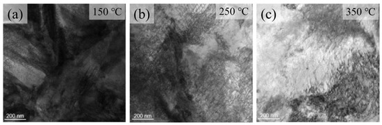 In order to investigate the reasons for the changes in hardness of samples under different tempering conditions, we conducted STEM analysis on samples tempered at various temperatures, as illustrated in Figure 7. Figure 7a–c represent the tempered samples at temperatures of 150 °C, 250 °C, and 350 °C, respectively. It can be seen that the number of dislocations formed after quenching significantly decreased with an increase in the tempering temperature. Zhang et al. [29] investigated the toughening mechanisms during the tempering process of high chromium steel, revealing that as the tempering temperature increases, the dislocation structure within the experimental steel significantly diminishes. Combining this observation with the relationship curve between the sample hardness and tempering temperature shown in Figure 5, we conclude that higher tempering temperatures effectively reduce structural defects; consequently, as these organizational defects diminish, the material hardness also tends to decrease. It is evident that as the tempering temperature increases, the number of residual structural defects (dislocations) remaining after quenching significantly decreases. This microstructural morphology corroborates the relationship curve between sample hardness and tempering temperature presented in Figure 5.