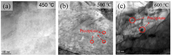 However, a continuous increase in the tempering temperature resulted in the formation of nanoscale precipitates within the matrix of the 90Cr18MoV alloy as shown in Figure 8a–c. Wang et al. [30] conducted a study on the aging strengthening of high-carbon high-Cr steel and found that the carbides precipitated during the tempering process have a certain reinforcing effect on the matrix. Furthermore, accumulation of dislocations around these fine carbides was observed, leading to a secondary hardening effect observed in the tempered samples. To gain a deeper understanding of the specific characteristics of these precipitates, further detailed analyses are required.