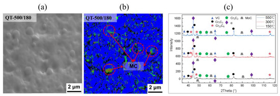 To further investigate the lattice structures of the above samples, we initially employed Electron Backscatter Diffraction (EBSD) to study the lattice structure of the samples post-tempering; the results are shown in Figure 9. Figure 9a presents the QT-500/180. The results indicate the presence of smaller carbides surrounding larger carbides. These are small carbides, specifically MoC and VC; some researchers have experimentally verified that carbides such as VC precipitate during the tempering process [31,32]. They are observed to precipitate exclusively around the particles of the larger carbides. The tempered samples were scanned by XRD and are shown in Figure 9c. The results again verified the existence of MoC and VC in the matrix after quenching. Furthermore, it was noted that the content of M23C6 and MC increased continuously with rising tempering temperatures.