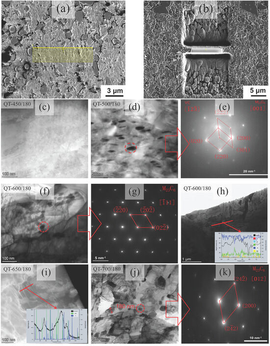 (a,b) illustrate transmission samples prepared using a focused ion beam (FIB); (c) presents the transmission image of the QT-450/180 sample; (d) shows the transmission image of the QT-500/180 sample; (e) displays the diffraction pattern corresponding to the QT-500/180 sample at a specific location; (f) depicts the transmission image of the QT-600/180 sample; (g) provides the diffraction pattern for a specific location in the QT-600/180 sample; (h) offers an energy-dispersive spectroscopy (EDS) line scan for the QT-600/180 sample; (i) presents an EDS line scan for the QT-650/180 sample; (j) illustrates the transmission image of the QT-700/180 sample; and finally, (k) shows the diffraction pattern corresponding to a specific location in the QT-700/180 sample.