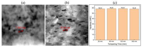 In the process of studying the effect of different tempering times at the same temperature on the size of precipitated carbides in samples, we observed that at a tempering temperature of 500 °C, the sizes of precipitates varied with different tempering durations, as illustrated in Figure 11a,b. The size of precipitates after 60 min of tempering was approximately 10 nm, while after 180 min it increased to around 20 nm. However, despite the increase in tempering time, there was no significant change in sample hardness within the margin of error; as shown in Figure 11c, all samples maintained a hardness level around 59 HRC. By correlating Figure 10j, Figure 11b and Figure 12d, we conclude that when the tempering temperature exceeds 500 °C, an increase in this temperature leads to continuous growth of secondary precipitate M23C6 within the sample matrix. When M23C6 is sized at or below approximately 20 nm, it contributes positively to enhancing the sample hardness. Conversely, once M23C6 exceeds a size greater than 30 nm, its further growth results in a declining trend in the sample hardness.
