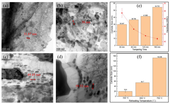 The carbides precipitated during tempering are randomly dispersed within the matrix, contributing to dispersion strengthening. From Figure 10, it can be observed that the precipitated carbides exhibit an fcc structure corresponding to M23C6. To quantitatively investigate the effect of carbide size on the hardness performance of 90Cr18MoV due to tempering, we employed transmission electron microscopy (TEM) to statistically analyze the sizes of precipitates in samples tempered at different temperatures, as illustrated in Figure 10j, Figure 11b and Figure 12d,f. As the tempering temperature increases, the average size of the carbides gradually rises. Specifically, after tempering for 180 min at a temperature of 500 °C, the average size of precipitates is measured at 19.9 nm. At a temperature of 600 °C, the average size of carbides in tempered samples reaches 54.7 nm; while at a temperature of 700 °C, this value further increases to an average size of 152.86 nm. The overall trend is consistent with the simulation calculation illustrated in Figure 6.