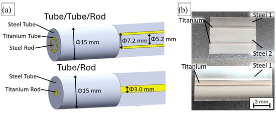 The research material consisted of multilayer, axisymmetric systems prepared in the form of two types of specimens: a tube/tube/rod system (TTR) and a tube/rod system (TR). The experimental work was carried out in two main stages. In the first stage, specimens composed of heterogeneous steel–titanium systems were produced. The TTR specimens were fabricated by placing a 7.2 mm × 1 mm titanium tube inside a steel 1 tube with an outer diameter of 15 mm, with a 5.2 mm steel 2 rod positioned in the interior of the titanium tube. The TR specimens were made from a steel 1 tube, also with an outer diameter of 15 mm, inside which a 3 mm titanium rod was placed; schematics for both systems are presented in Figure 1a. In the TTR system, the titanium cross-sectional area accounted for 11% of the total cross-section, whereas in the TR system, it accounted for 4%. All materials were in the annealed condition. The multilayer systems prepared in this manner were then annealed at 700 °C for 20 min in a flowing argon atmosphere. The adopted annealing conditions were selected as a compromise between the annealing requirements of steel and titanium and were based on microstructural observations conducted after various combinations of temperature and time, with the aim of obtaining a fully annealed microstructure in both materials. Both types of specimens were subjected to calibration rolling, which reduced the outer diameter of the investigated systems from 15 mm to 6.5 mm. Longitudinal sections of the produced samples are shown in Figure 1b.