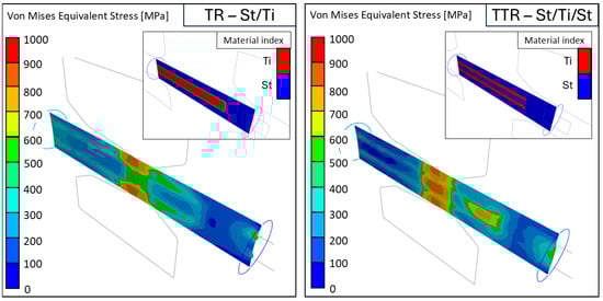 Representative results of numerical simulations for the investigated multilayer systems. Examples of stress intensity distributions (Mises equivalent stress) in the cross-sections of TR and TTR samples after the second pass of the wire.