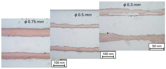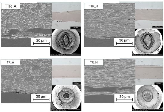 The results of scanning electron microscopy and optical-light observations (Figure 5) indicate significant differences in microstructure evolution in TTR and TR samples, both in the work-hardened condition and after annealing. A stronger grain refinement in the steel is visible, accompanied by a clear initiation of loss of cohesion in the Ti layers. Figure 6 shows the effects of further deformation, up to a diameter reduction to 0.3 mm, for samples drawn from the work-hardened state at a diameter of 1 mm. A clearly higher degree of fragmentation of the Ti layers can be observed in the TTR samples. It may be assumed that this behavior is primarily influenced by the characteristic stress heterogeneity, exemplified in Figure 3.