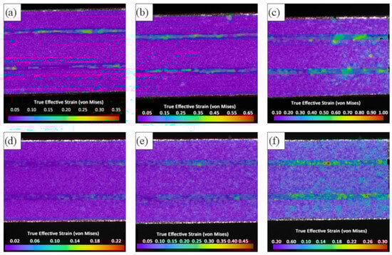 Results of micro-DIC analysis of longitudinal cross-sections of TTR samples after drawing to a diameter of 1 mm. Distributions of effective strain from the moment the yield stress is exceeded (a,d) to the attainment of the maximum tensile stress (c,f) for samples in the strain-hardened condition (a–c) and the annealed condition (d–f).