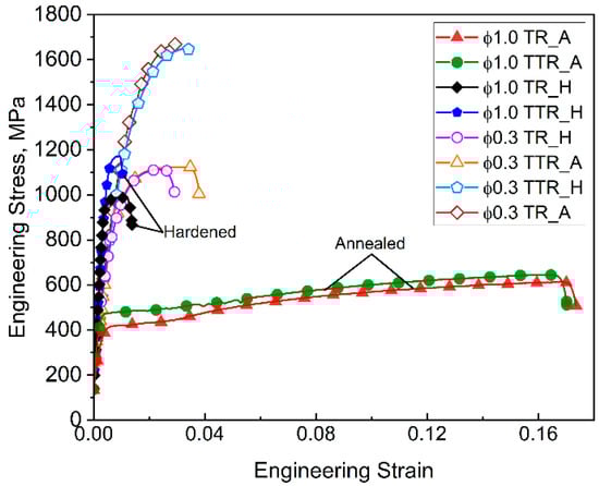 The representation of the mechanical response of the investigated multilayer systems is shown in Figure 10. The results of tensile tests of the TTR and TR systems after drawing to final diameters of 1 mm and 0.3 mm are compiled there. For the diameter of 1 mm, the curves represent the strain-hardened states (ϕ1.0 TR_H, TTR_H) and the annealed states (ϕ1.0 TR_A, TTR_A), whereas for the diameter of 0.3 mm, they correspond to strain-hardened states obtained by drawing from 1 mm diameter wires that were either strain-hardened (ϕ0.3 TR_H, TTR_H) or annealed (ϕ0.3 TR_A, TTR_A).