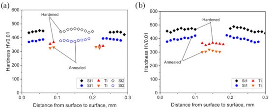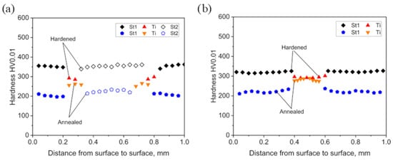 Hardness distributions across the cross-sections of wires drawn from 1 mm diameter stock, initially in annealed or hardened conditions, to a final diameter of 0.3 mm: TTR (a); TR (b).