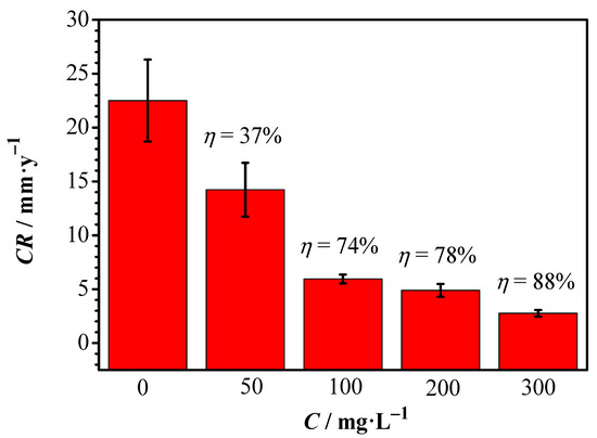 The weight loss test is the most classical and accurate method for evaluating the corrosion inhibition behavior of inhibitors. The CR plot based on the weight loss data is presented in Figure 2. It shows that the most severe corrosion by the 1 M HCl solution occurred without the inhibitor (22.5 mm/y). The presence of C. vulgaris inhibited corrosion. The inhibition efficiency at a low dosage of 50 mg/L was 37%, and it increased with increasing C. vulgaris concentration. The inhibition efficiency was 74% at 100 mg/L inhibitor, 78% at 200 mg/L inhibitor, and 88% at 300 mg/L inhibitor concentrations, indicating a positive correlation between the corrosion inhibition effect of C. vulgaris on carbon steel in 1 M HCl and its concentration.