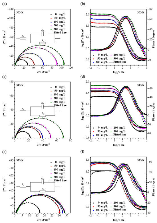 Nyquist and Bode plots for carbon steel after 1 h exposure in 1 M HCl solution at different C. vulgaris concentrations and temperatures, and the equivalent electrical circuit used to fit EIS data is shown in the Nyquist plot. (a,b) are Nyquist and Bode plots at 303 K, respectively; (c,d) are Nyquist and Bode plots at 313 K, respectively; (e,f) are Nyquist and Bode plots at 323 K, respectively.