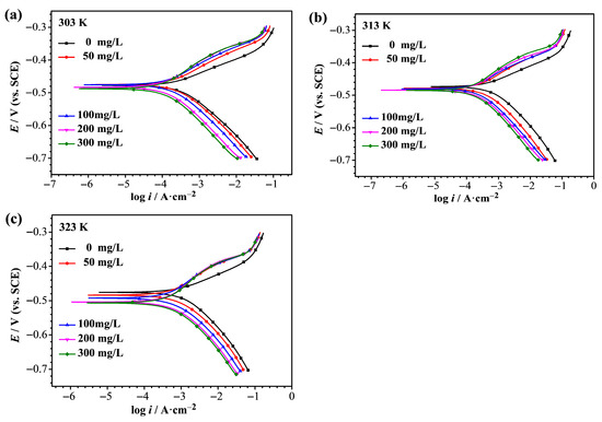 (a–c) represent the potentiodynamic polarization curves of carbon steel after 1 h of exposure in 1 M HCl solution containing different concentrations of Chlorella vulgaris at different temperatures.