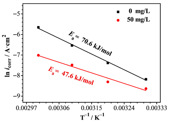 In which A is the pre-exponential factor. A and Ea were calculated from a linear regression of lnicorr vs. 1/T. The value of Ea is shown in Figure 6. The high Ea value of 70.6 kJ/mol corresponded to the absence of the inhibitor. With a 50 mg/L inhibitor, it decreased to 47.6 kJ/mol. This is common for corrosion inhibitors [1,49]. The value of lnA decreased from 19.8 (0 mg/L inhibitor) to 10.1 (50 mg/L inhibitor), and the significant decrease in A offset the unfavorable decrease in Ea, leading to a decreased icorr. This behavior suggests that inhibitor adsorption alters the metal–solution interface, reducing the number of active sites available for charge transfer and changing the nature of the rate-determining step. Therefore, although the apparent Ea decreases, the overall corrosion rate is still substantially reduced due to the dominant effect of the lowered A value. This phenomenon has been reported in several inhibitor systems where surface coverage and interfacial restructuring play a more critical role than the energy barrier alone [49].