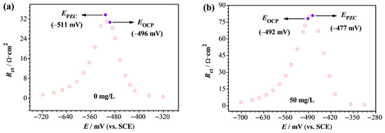 In Figure 7, the value of Er in the absence of C. vulgaris is 15 mV. This positive value suggests that the carbon steel surface had a positive charge. In comparison, when there was 50 mg/L C. vulgaris in the acid solution, Er became negative (−15 mV). The negative value was attributed to the accumulation of cations at the beginning, and the negative surface state was beneficial to the adsorption of cations in the C. vulgaris powder.