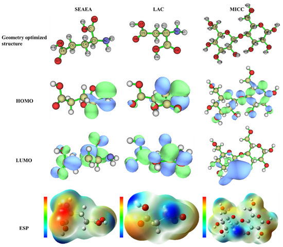 Structure optimization, HOMO, LOMO, and ESP plots of SEAEA, LAC and MICC.