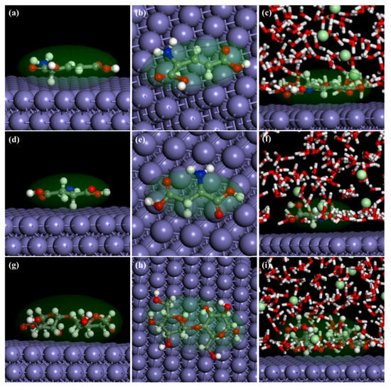 The MD simulation of SEAEA, LAC and MICC adsorbed on the Fe(110) surface; (a,b) are side views and top views of SEAEA on the Fe(110) surface in vacuum state, (d,e) are side views and top views of LAC on the Fe(110) surface in vacuum state, (g,h) are side views and top views of MICC on the Fe(110) surface in vacuum state, and (c,f,i) represent side views of SEAEA, LAC and MICC on the Fe(110) surface in 1 M HCl, respectively.