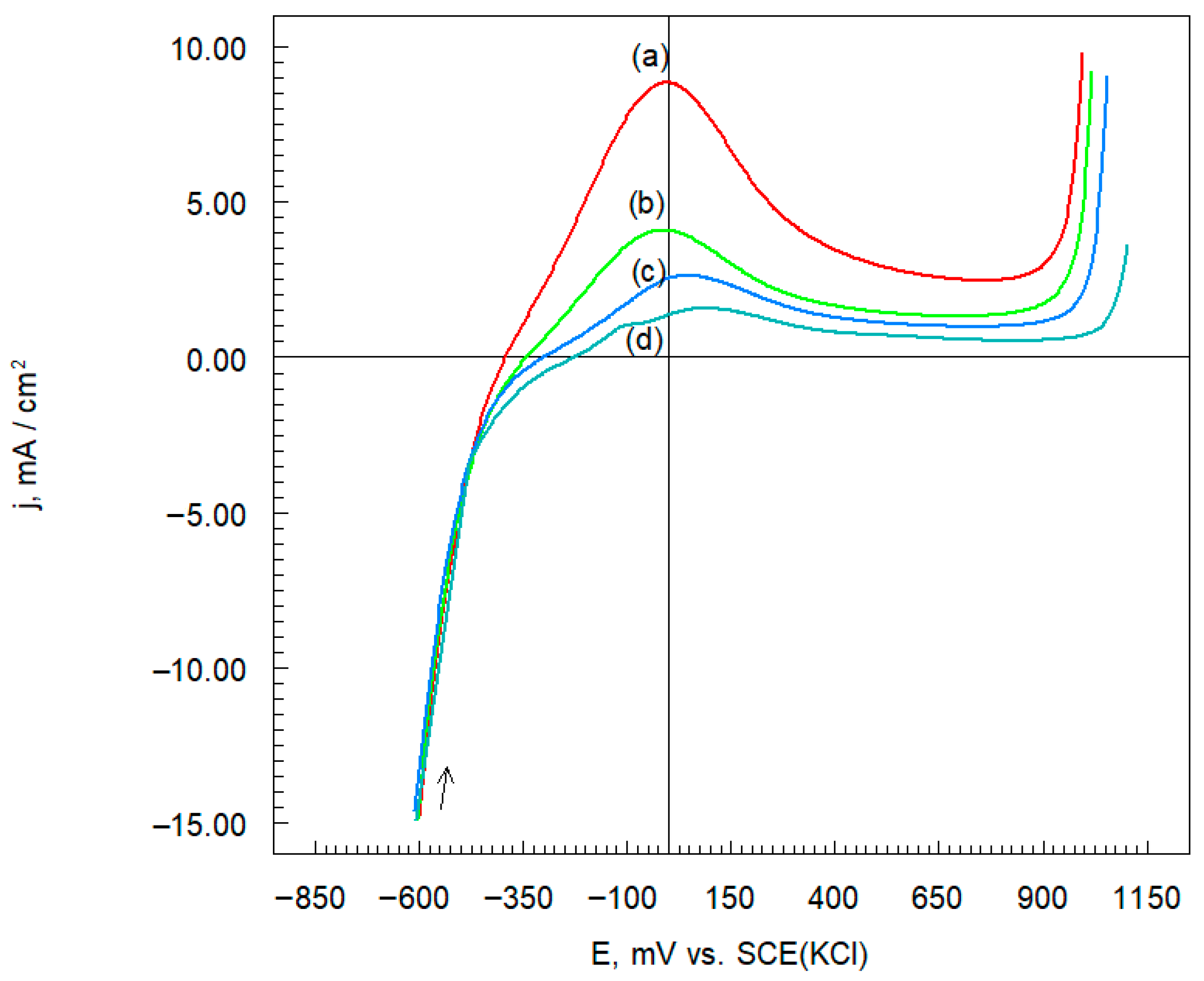 - For the highest NO3− concentration, a fairly high (approximately 80%) degree of electrode surface coverage (SC) and the lowest value of linear surface roughness (Ra) were achieved.