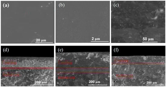 (a,b) Surface morphology of the composite coatings; (c) cross-sectional morphology of the composite coatings; (d–f) the cross-sectional morphology of the coating on Tin, RCS, and SS substrates.