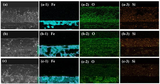 The cross-sectional morphology of the coating on (a) Tin, (b) RCS, and (c) SS substrates, and the comprehensive element mapping of (a-1–c-1) Fe, (a-2–c-2) O, and (a-3–c-3) Si elements, respectively.