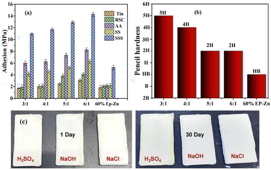 (a) Adhesion strength for the Ep-PSA coatings with the A:B component ratio from 3:1 to 6:1, and 60% EP-Zn coating on different types of metal substrates; (b) pencil hardness for the Ep-PSA coatings with the A:B component ratio from 3:1 to 6:1, and 60% EP-Zn coating; (c) images of carbon steel sheets coated with the as-prepared coating after being immersed in different solutions for one month (A:B = 4:1).