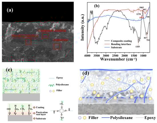 (a,b): Micro-IR characteristics of the coating, bonding interface and metal substrate of coatings; (c,d): anti-corrosion mechanism diagram of the as-prepared EP-PSA coating.
